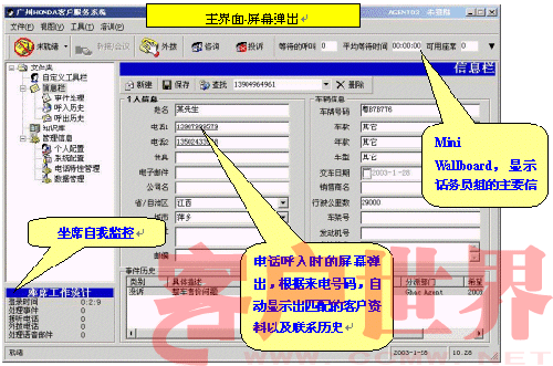 当客户的电话被转到客户服务人员时,客户的所有相关信息将自动弹出显示在服务人员的电脑屏幕上,包括历史接触记录信息等,这样就能提供最具有针对性和高效率的服务。如果是新客户,那么服务人员将即时录入信息,动态扩充数据库。