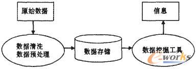 与传统的统计分析相比。数据挖掘的确不用专门进行实验设计和调查设计。不用为确定的目的准备大量的数据,因为在进行数据挖掘之前已有数据库,其目的也是不确定的。作为一种先进的数据信息处理技术,数据挖掘与传统的数据分析的本质区别在于它是数据关系的一个探索过程.而且多数情况下是在没有任何假设和前提的条件下完成的。就现实来看。经过几年的信息化建设,许多大中型企业已经建立了比较完善的客户关系管理(CRM)、ERP、OA等基础信息化系统,这种大集中系统已为数据挖掘准备了较为成熟的条件。但直接从数据库中截取的数据往往是冗余的、缺失的、有噪声的,从而直接影响数据挖掘的效果。输入数据库中的异常数据、不相关的字段或互相冲突的字段、数据的编码方式等,都会对数据挖掘输出结果的质量产生影响。数据挖掘最后成功与失败,是否有经济效益。数据准备起到了至关重要的作用。从原始数据转化为挖掘信息的流程如图1所示。