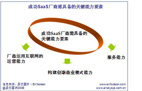 首先是厂商运用互联网的运营能力。主要是能体现SaaS“低成本、规模化”的特点,首先,它的前提是厂商需有比较强的产品技术开发能力,互联网特点有成本低、效率高、不受时空限制以及规模化等特点,这就要求厂商必须能够提供标准化较强、简单易用的产品/服务,使用户能够较快地进行应用,在任何时间、空间都可以登录,获得该服务。厂商拥有良好的技术开发 能力,将有助于其为用户提供技术可靠、性能稳定的产品和服务。其次,在产品和服务基础上,厂商需有迅速拓展市场的能力。厂商获得高收益的前提是拥有足够规模的付费用户,这就需要厂商能有资源或渠道可以比较快地借助互联网迅速积累人气,通过提供良好的产品和服务能提升用户粘性,从而拥有比较多的付费用户。