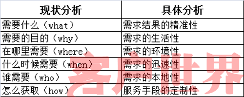 明辨客户需求,是提升客户体验的基础。目前很多语音搜索号码大多根据客户对业务需求的不同,推出了不同的专业延伸服务,并取得了很好的成效。由于使用移动语音搜索的客户在使用搜索时的环境、时间、地点有所不同,我们需要结合这些要素,对客户需求进行深入分析,以保证呼叫中心能够提供更好的客户体验。下文将采用5W1H分析法,对移动语音搜索时客户需求的特点进行分析。