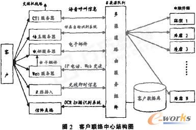 企业的营销人员如果没有即时充分的客户数据和市场资料。工作将难以开展.因此跟客户的接触与联络变得尤为重要。数据库营销的客户接触和联络主要有两部分构成:一是通过销售部门的产品服务销售渠道与客户进行接触,及时记录下客户的销售情况:一是通过客户服务部门的客户联络中心与客户进行沟通和交流.通过多媒体、多渠道整合以及智能搜索的方式来帮助客户找到最佳座席(客户服务点)并为其提供优质服务。其中的客户联络中心,就是一个集电话、电邮、传真、网络、信函等一系列数字和非数字渠道的客户交互平台。在这个平台上客户可随时随地选择自己喜欢的方式同企业进行交流,而企业也借此深入了解顾客意见和需求,以最快速度帮助客户解决实际问题,与此同时,中心也尽量搜集其相关信息.做到客户信息的。零流失”,为以后的营销及销售工作提供依据。其优点在于:对企业而言,接触效率高、记录信息全且便于存取和管理、提高顾客满意度;对客户而言,便利和选择个性化、即时交互性强、有亲切感、从而对企业产生良好印象。客户联络中心集成多种渠道路由服务组件和相应服务器,以客户联络信息为本,通过相应服务器和数据库执行业务逻辑,找出最佳座席代表,并进行客户信息更新和记录。整个过程计算机处理,客户呼叫效率非常高。一个典型的客户联络中心如图2所示。