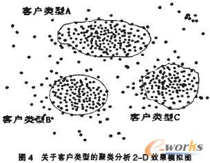 聚类分析运用到营销领域,比如大型购物超市对于会员客户进行类型识别以便更好地提供优质服务,可从这家超市的会员客户数据库中调出所需的消费数据,经过数值化处理的多维数据模式为:客户识别码(总消费额,购买次数,收入水平,……)。其中总消费额,购买次数,收入水平等多维变量都是同客户类型划分直接相关的数据。根据会员数(N)及客户类别数(K)等分析信息进行聚类分析,可得到相应的结果簇,模拟的2一D效果图见图4。