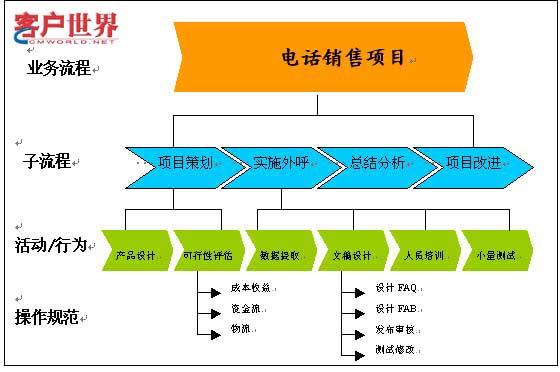 在呼叫中心的管理上,通常人们会把整个运营管理的策略拆分成战略管理、人力资源管理、流程管理、技术管理四个层次,事实上流程的穿越在这四个层次上是无处不见的。试想相同素质的新入职员工,经过不同培训流程培训出来后的效果肯定是不同的,因此无论是哪个方面都离不开有效的流程管理。以下是实施一个电话销售项目时将会涉及的部分流程(图二),我们按照流程的操作层次依次分解为业务流程、子流程、活动/行为及操作规范四个层次。下一级层次的输出结果将直接影响到上一级层次的输出效果,最终将影响到整个项目的运营成果。在笔者的职业生涯中曾经就有过这方面的教训,在某个电话营销项目开始前,由于忽略了对物流配送的重视,当销售量节节攀升的时候,却发现配送能力无法配合,以致不能在承诺时限内将货物送到客户手中。虽然后来采取了应急措施,但大量的客户投诉和退货仍然给整个项目的运营绩效带来了负面影响。因此一个高效运营的项目就必须在项目开始前制定周密的计划,将所有工作和面临的问题层层分解下去,以形成最底层的操作规范。这些操作规范就成为项目流程中的最小单位,当这些基石都一步步搭建起来后,项目的运营绩效自然就得到了初步的保障了。