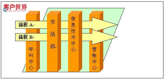 事实上,一个电话销售流程在执行的时候可能会牵涉到若干个部门,而每一个部门都会介入到不同的流程当中(图三)。因此在设计这些跨部门的流程时,每个环节的输出成果将在很大程度上决定了流程的执行效果,这个输出成果包括时限和输出记录。例如以移动行业的电话销售项目为例,由于市场竞争的激烈,项目的实效性就变得尤为重要。当项目发起部门(通常是市场部)策划一个电话销售项目的时候,通常需要各部门进行一些配合工作,例如需要信息技术中心提供测试名单,需要呼叫中心提供销售项目的文稿及其他相关文档等,这些活动是在每个电话销售项目中都可能会遇到的一些重复性工作,如果每次大家都来就这些问题进行沟通,势必影响工作效率。因此,在流程设计上,就要和相关部门一起来讨论,确定每个环节完成需要的工作时间及输出的成果和记录。这样将来各个部门就可以按照流程的指引来有序的工作。
