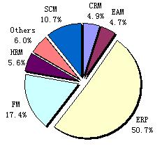 赛迪顾问定义的管理软件市场包括财务管理软件、ERP软件、CRM软件、SCM软件、HRM软件、EAM软件等细分产品市场。2006年ERP软件销售额已经独占50.7%的比例,但是在增长率方面,对人力资源管理、激励制度、绩效考核等规范化需求的上升使HRM软件同比增长了26.1%;对销售、客户资源的精细化管理带来CRM软件25.7%的同比增长率;另外,一个值得关注的亮点是EAM软件比去年同期增长了24.8%,增长的主要动因来源于EAM软件应用从电力行业向其它资产密集型行业,包括能源、精密制造、公共事业等领域的迅速渗透。这三类产品的较快增长反映了一个有趣的特点是:这三类产品都是基于关系的管理,包括客户关系、供应商关系、员工关系,这表明企业用户正试图从不同角色的关系理顺、定位清楚、联系强化中寻求管理的改进。虽然这个特点仅仅是从不同产品线的销售趋向透示出的,但实际上它表达了用户对于流程规范、精细管理的愿望。