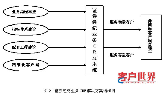 基于以上对CRM理论的探讨,结合我国证券经纪业务客户管理现状的分析以及我们的理论思考,在推动经纪业务客户关系管理解决方案的过程中,我们认为,重点是探索经纪业务管理系统再造问题、CRM指标体系的设计问题、CRM系统配套工程的建立和完善问题、CRM实施过程中的精细化客户端管理问题等四大方面(解决方案结构图见图2)。