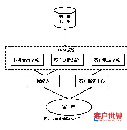 总体而言,券商经纪业务的CRM 系统一般由业务支持系统、客户分析系统和客户联系系统三部分组成。业务支持系统的功能主要是为经纪人的业务活动提供信息支持, 通过智能化工具协助经纪人进行客户和市场分析。客户联系系统的功能主要是为客户提供集成化的沟通渠道和为客户提供信息咨询服务。客户分析系统则以中心数据仓库为核心, 为各分支业务系统提供集成数据处理, 同时为管理层和业务分析人员提供客户分析资料。这一管理系统结构图示如下(图3):