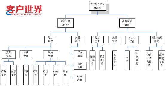 在综合型客户服务中心中,内部各个部门的沟通、协调与对各个相对独立部门的监管是非常重要的,因此,主管监管部的副总经理是非常重要的职位,他的设定应该高于主管运营部的副总经理。同时,为了保证工作的效率,负责运营分析的经理是可以跨过各级管理人员直接与中心最高管理人员联系、提交报告的(图中用红线标示的)。