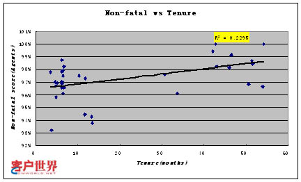很多时候,我们脑子会存在着一种印象,任期越长、服务经验越多的员工,监控成绩就会越好,但是从上图中我们看到,长期以来的习惯性思维被数据所打破,任期与质量数据并不存在很强的关联关系,这样的数据分析就避免我们陷入了一些改善的误区。