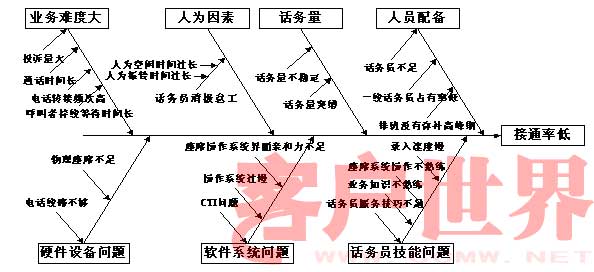 在制作因果图时,要集思广益,由表及里、追本溯源,确定主要原因,并到现场作调查,再制定解决措施。因果图是进行呼叫中心质量管理的一个有效工具,下面以分析呼叫中心的接通率低为例说如何进行因果图分析。