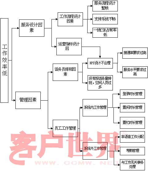 关联图也称为关系图法,是用箭线表示各项存在问题及其要因以及要因之间、各项目及其手段及手段之间错综复杂的相互之间的逻辑关系的图形。在对呼叫中心服务质量进行分析时,经常使用到关联图法,我们在这里介绍一下单向汇集型关联图,也就是要将分析的几个问题放在图的一侧,因素则层层向相反的方向展开。下面以呼叫中心的工作效率过低为主要问题进行层层原因分析建立关联图如下所示: