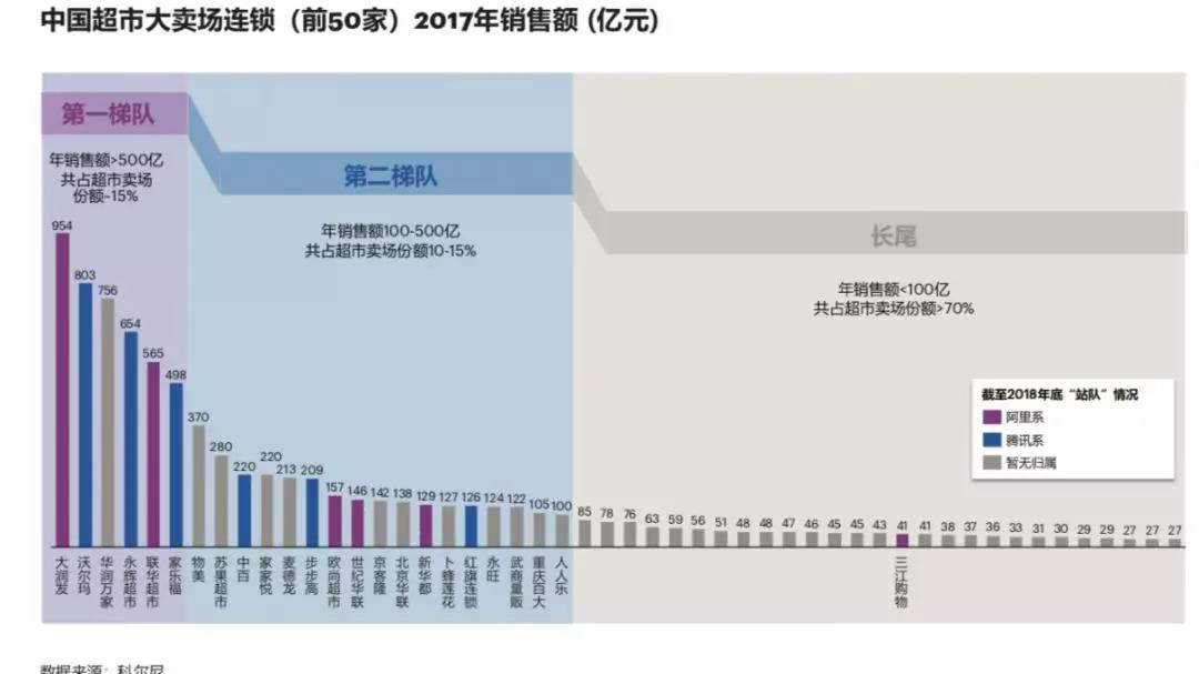 长期以来中国零售业格局高度分散。且不论百万计的传统小店,单看现代渠道超市卖场,前6大连锁集团所占份额仅为15%(大润发、沃尔玛、华润万家、联华、永辉、家乐福,见下图);这与美国前三大超市份额超过40%、英国前三大份额近60%的格局大相径庭。这种高度分散的格局为品牌商和零售商之间的博弈设定了基本的游戏规则。然而,2017年底到2018年初,阿里、腾讯对各大连锁集团的股权参与,似乎可能打破这一基本格局。据科尔尼统计,综合考虑线上线下多种业态,阿里、腾讯、京东通过自建、控股、参股等方式,控制或影响了中国食品饮料零售市场高达20-30%的份额。如果阿里、京腾成为中国零售市场的实质整合者,这将引起整个产业价值链的深刻变化。但是,这是否是他们真正的战略意图呢?