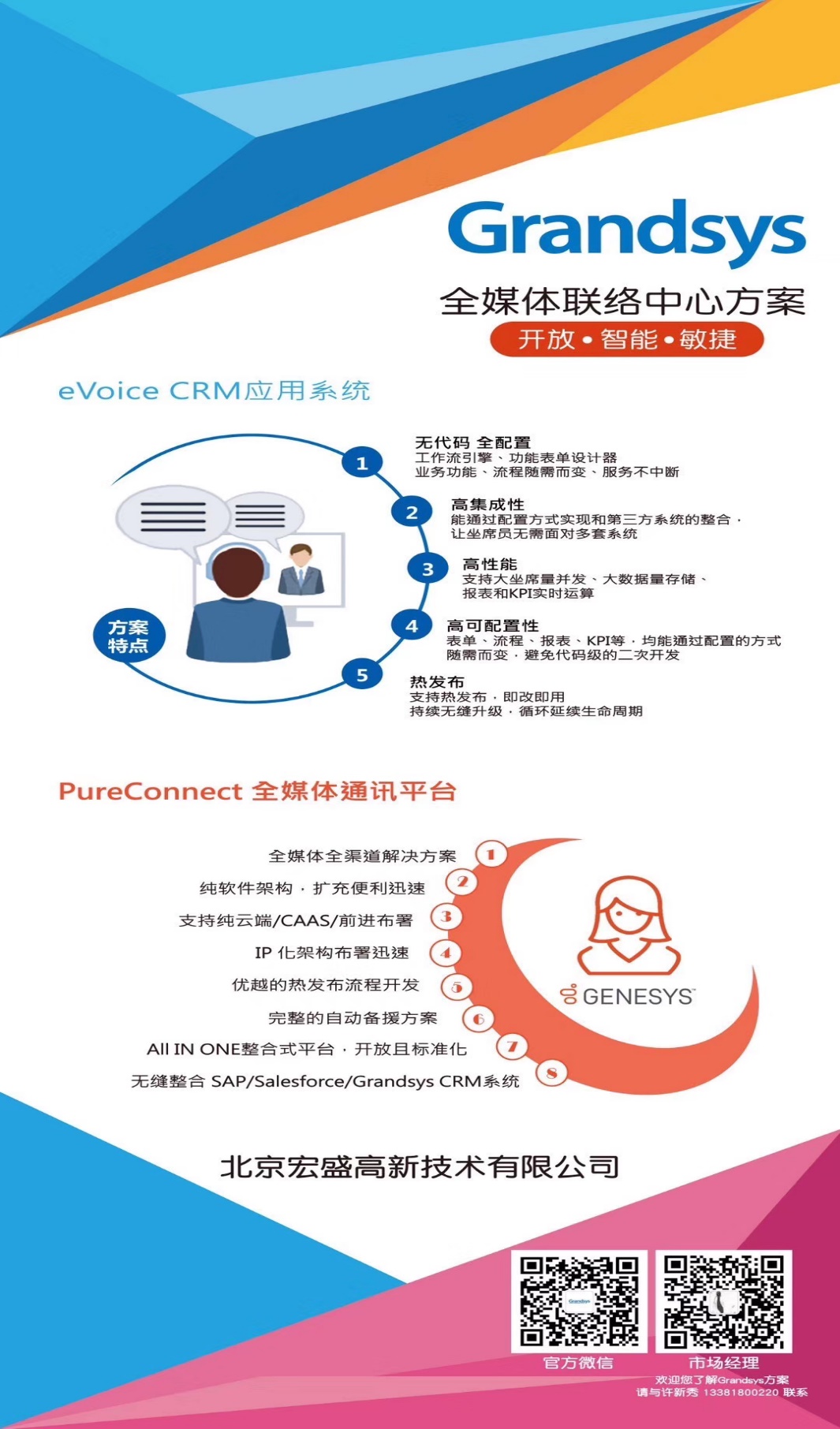 北京宏盛高新技术有限公司(Grandsys)是一家国家认证的高新技术企业,深耕中国大陆呼叫中心行业近20年,积累了丰富的实施与服务经验。Gransys坚持以客户为中心,以发展为已任,并长期专注于自有品牌的研发,拥有超过70%的技术人力与设计研发团队。