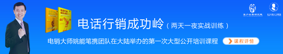电话行销成功岭(两天一夜实战训练)是由“客户世界研究院CCMI”联合“姚老师电话行销团队”第一次面向国内呼叫中心业界推出的大型公开课程。来自台湾的电销大师姚能笔将率团队中多位重量级专家倾情讲授并现场辅导。如果您是在电销岗位从事销售和管理工作的同仁,正为团队士气难以鼓舞、营销业绩无法突破而困扰;如果您正关注如何帮助服务型呼叫中心实现“服务转营销”,欢迎您莅临现场学习和交流。 相关新闻: |